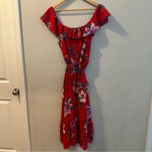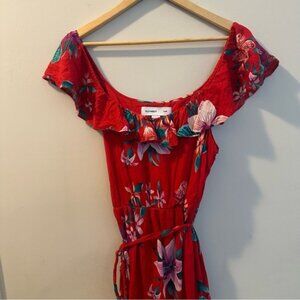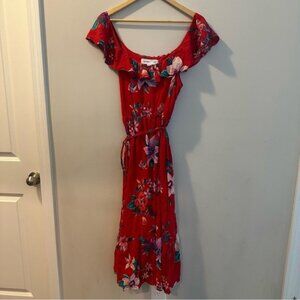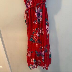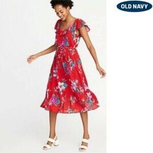 Old Navy Ruffled Red Floral Slub-Weave Tie - Belt Midi Dress for Women Sz. Large