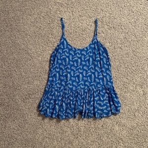 Loose, flows tank top in a really pretty blue color. The straps are adjustable and the top has really cute ruffles on the bottom. The top is covered in white coral.