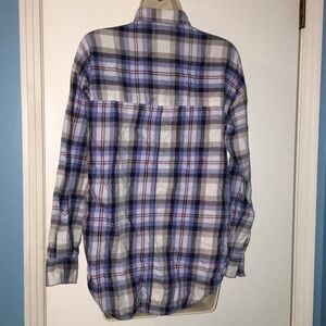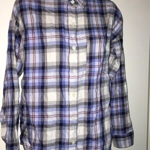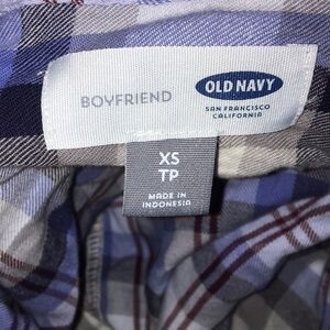 Women’s xs Old Navy boyfriend plaid shirt with black, navy, maroon, gray and white. It’s a little wrinkled but otherwise in good condition. The length is 23 inches and it’s 28 inches in the chest.