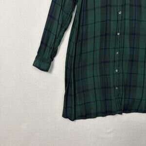The Old Navy shirt dress in women's size small tall is a stylish and versatile piece perfect for casual occasions. Featuring a green plaid pattern, long sleeves, collared neckline, and pullover closure, this knee-length dress is made from lightweight rayon material. The dress has a preppy, grunge, country, and skate-inspired theme, making it a great choice for summer, fall, and spring. With accent buttons and a dark academia style, this shirt dress is a must-have for women looking for a fashionable and comfortable outfit.