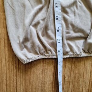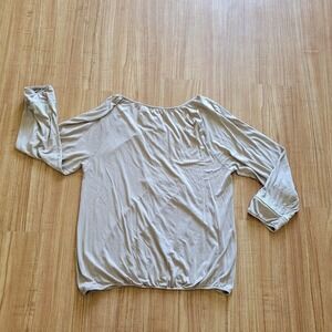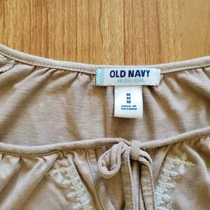 Old Navy womens shirt size medium. Beige with white embroidery at the neckline and wrists, v neck with tie closure, jersey fabric, elastic at the hemline, elastic at the wrists. In excellent preowned condition.
