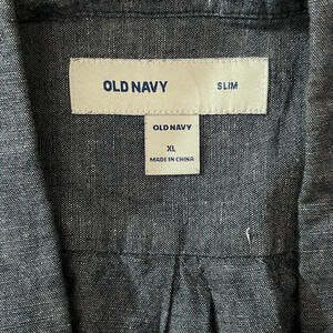 This Old Navy shirt is a stylish and versatile addition to any man's wardrobe. Made from a comfortable linen and cotton blend in a classic chambray color, this slim fit button-up shirt features a collared neckline and long sleeves, perfect for travel, casual outings, or workwear. With a solid pattern and a nautical, outdoor theme, this shirt is suitable for all seasons and offers a slimming and easy-care option with a touch of preppy style.