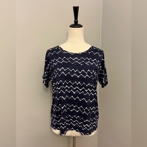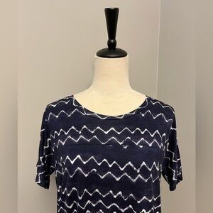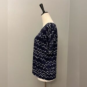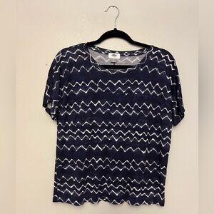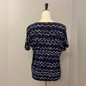 Soft, stretchy material. Variegated navy blue with white horizontal chevron stripes; reminds me of ocean waves! Boxy shape, relaxed fit. Versatile wear; can be worn casually or dressed up with a cardigan or blazer and work pants Very good used condition (VGUC)