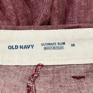 These Old Navy Men's 38 Red Linen Ultimate Slim Flex Shorts are crafted from lightweight linen for a breathable feel. With a 10" inseam and Ultimate Slim Flex technology, they provide a sleek, comfortable fit. The red chambray fabric adds a touch of color, making these casual chinos perfect for relaxed summer days or weekend outings.