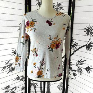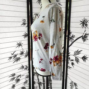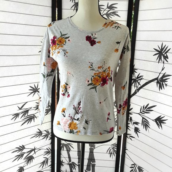 Features a scoop neck and long sleeves. Soft, lightweight fabric. Beautiful color flowers throughout. High low design with the back being a little longer.