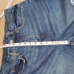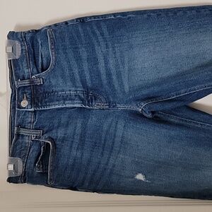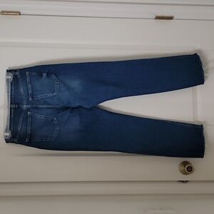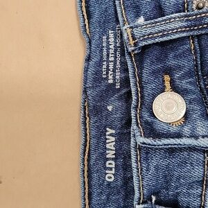 Old Navy Size 4 Ultra High Rise Super Straight Button Fly Jeans with Frayed Hem. Medium Dark Wash. Factory Fading, Whiskering and Distressing. Classic 5 Pocket Styling with Button Fly Closure. Gently Used Condition, No Holes, Rips, Stains or Snags. No Pulling or Puckering at Crotch Area. Please refer to measurements in photos to ensure proper fit.