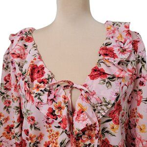 Old Navy Size L "Bed of Flowers" Pink Floral Ruffle Trim Blouse, NEW with Tag. Color is "Bed of Flowers". Relaxed fit, with a cinched, defined waist. Hits at hip. Tie-front V-neck with ruffle overlay. Long-sleeved with elasticized cuffs. Elasticized, drawstring waist. 100% Polyester. Please refer to measurements in photos to ensure proper fit. Shown on size 4-6 mannequin.