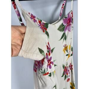 Item Description: White cami dress with tropical floral print, adjustable straps, ruched back.