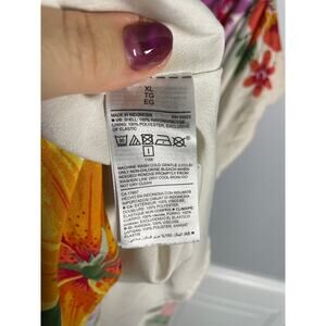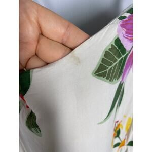 Color: White with tropical floral print in pink, green, yellow, and red