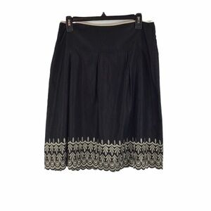 Design features: A-line, low waist, pleats, embroidered hem, side zip