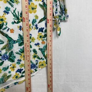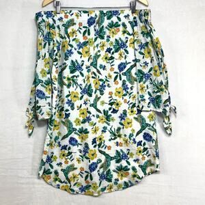 ✧ Notes: 100% Cotton, Lined. Off-Shoulder, elastic top hem. 3/4 sleeve, with tassels at end cuffs. Super lightweight, breathable. Cute floral/tropical/bird (parrots!) print throughout. Would be a perfect swim coverup!