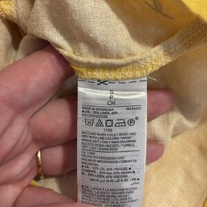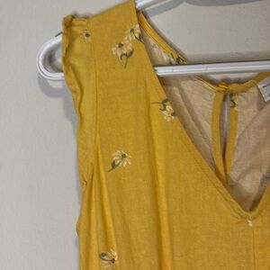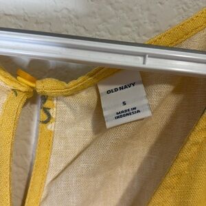 Clean and no damage size small old navy linen blend romper. Size small. Yellow with white daisy print. Super cute! Ruffle on shoulders. Elastic and belted waist. Has pockets!!!