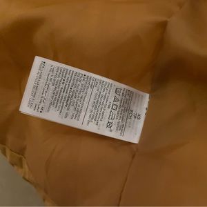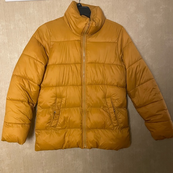 Yellow/orange, color. Lightweight puffer jacket in excellent condition. The only issue is the coat was hung up by the fabric loop and the loop broke (you can see it in the photos) The coat itself is not torn so that broken loop is the only damage on this coat . It is in excellent condition, and other than the fore mentioned it seems perfect.