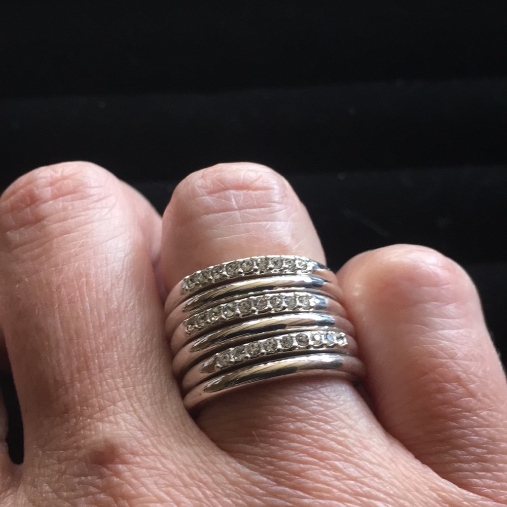 Six rings total three with diamonds three just silver bands. The possibilities are endless with these rings because they are detached and can be styled several ways. Good used condition no missing stones.