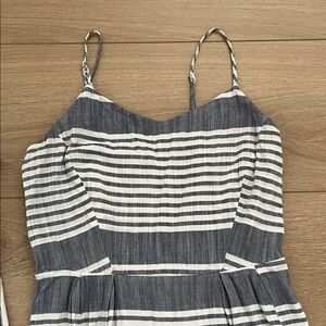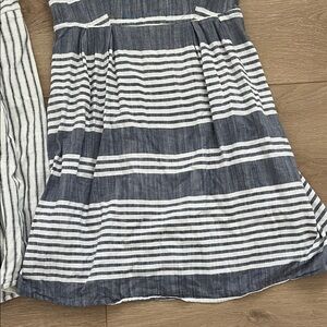Set of two striped dresses. One white with black stripes. One blue with white stripes. Sleeveless with button details. In good used condition with no callouts