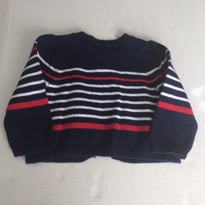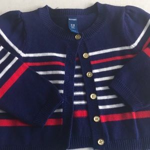 Adorable button up cardigan enhanced with gold plated buttons. Blue with red and white stripes. Girls size 12-18 Months. Excellent Condition. Old Navy