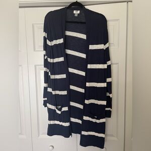 Old Navy striped long cardigan — navy blue and white. Well loved with lots of life still left. Smoke free, cat friendly home.