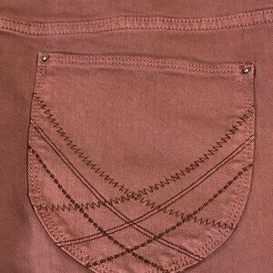 These pants are a pair of women's skinnyt-leg jeggings in a brown /lilac color.
