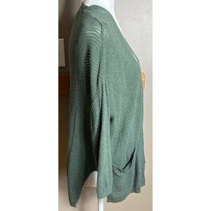 Green lightweight semi-sheer knit open cardigan sweater, 3/4 sleeves, front pockets, side slits, cotton rayon.