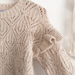 Fall, winter, warm, cozy, neutral, pointelle knit, ruffle, girly, feminine.