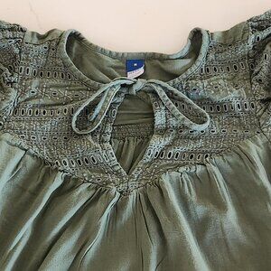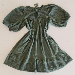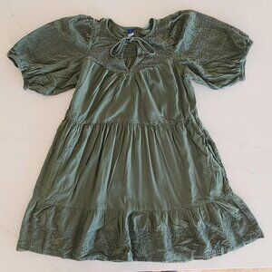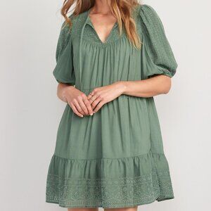 Old Navy Sz M Puff-Sleeve Tiered Embroidered Mini Swing Mini Dress Green Boho
