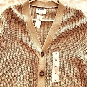 This tan cardigan from Old Navy features a classic ribbed knit pattern, offering a timeless and versatile addition to your wardrobe. Its medium-weight knit ensures comfort and warmth, making it perfect for layering in cooler weather. The V-neck design adds a touch of elegance to this essential piece.