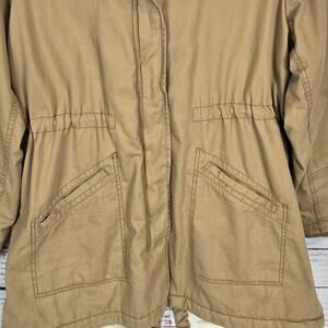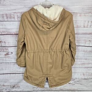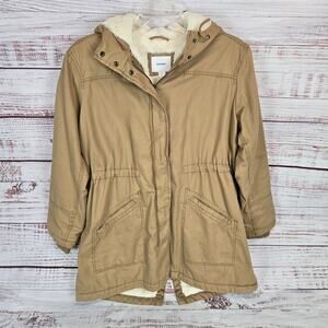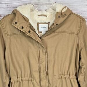 Old Navy Tan Hooded Parka Size L Cream Sherpa Lined Coat Zip Snap Pockets Cozy