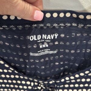 Elevate your wardrobe with this charming blouse from Old Navy. The tan and navy polka dot pattern adds a playful touch to any outfit, while the ruffle detailing on the short sleeves creates a feminine and stylish look. Made from high-quality materials, this blouse is both comfortable and durable, making it a practical addition to your closet. The medium size fits true to size and flatters most body types. Perfect for work or weekends, this versatile blouse can be dressed up or down to suit any occasion.
