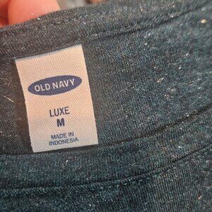Soft and stylish short sleeve tee by Old Navy in a teal heather shade with subtle sparkle throughout. Features scoop neckline, curved hem, and lightweight fabric for an easy, flattering fit. Great for casual wear or adding a touch of shine to everyday outfits.