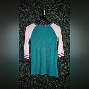 Chic raglan dress in teal and cream. Features purple stripe accents. Ideal for casual outings.