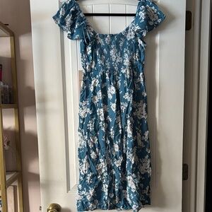 Charming midi dress with floral design. Features ruffled sleeves and a flattering silhouette. Perfect for any occasion.