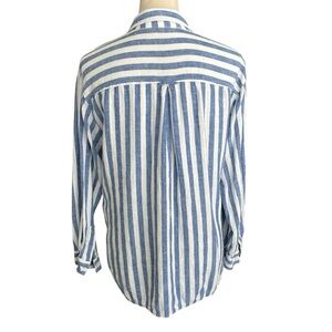 Classic and versatile Old Navy women’s blue striped linen blend button up shirt. Features a lightweight, breathable fabric perfect for layering or wearing on its own. Designed with a relaxed fit, collared neckline, and button front closure for a timeless look. Ideal for work, casual outings, or vacation wear. Pairs effortlessly with jeans, skirts, or shorts. A must-have staple for any wardrobe.