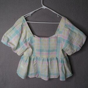 Old Navy Top 2X Multicolor Square Neck Checked Seer Sucker Puffy Short Sleeves