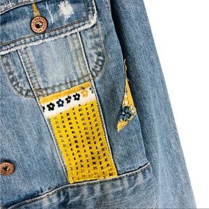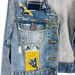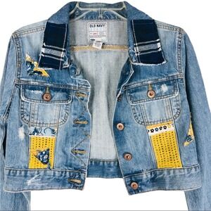 Old Navy Upcycled blue yellow floral quilt star western crop jean jacket medium