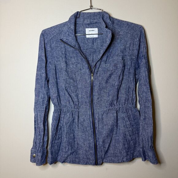 Old Navy Utility Jacket Size Medium M Blue Linen Blend Chambray Full Zip Snaps
