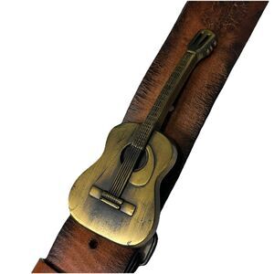 Old Navy Retro Style Brown Leather Belt Guitar Buckle Brass Tone Mens 40