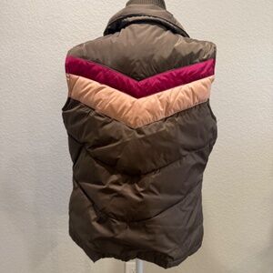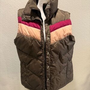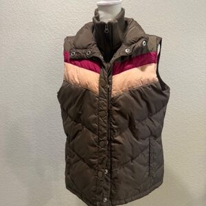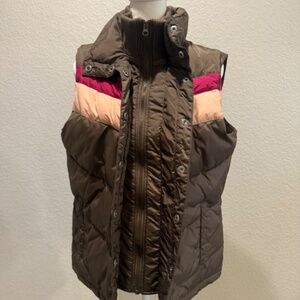 Brown and pink vintage inspired ladies puffer vest with a full zip front, size large. Perfect for layering in cooler weather. Quilted inside and has snap button in addition to zipper closure. Great condition, only worn twice and has been hanging in my closet ever since. Make me an offer.