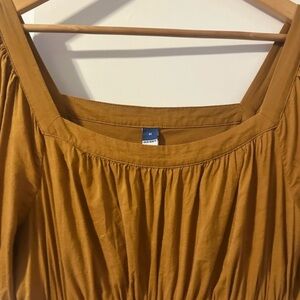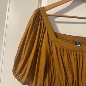 Old Navy Waist-Defined Puff-Sleeve Smocked Mini Dress in Chaparral (burnt orange). Features a banded square neck, short puff sleeves with elasticized cuffs, and a defined smocked waist. Flared, mini-length skirt. Shirring throughout. Soft garment-washed cotton/rayon-blend.