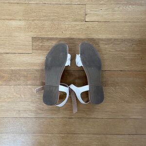 White dress sandals by Old Navy. Tan sole, white braided straps on the toes, white ankle straps with buckle, and very slight heel. Size 1. Minor scuff on toes - see picture. Great condition otherwise!