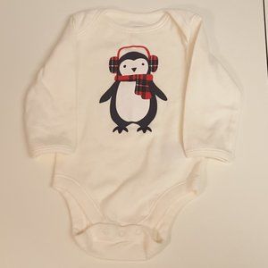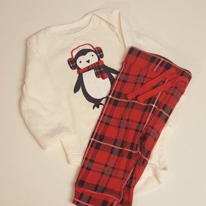 Onesie and pants set by Old Navy, New without Tags. Red plaid drawstring pants, and white onesie with penguin wearing earmuffs and scarf on front. size 3-6 months.