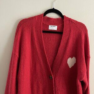 Old Navy Women M TALL Red Heart Graphic Knit V-Neck Slouchy Cardigan Sweater.