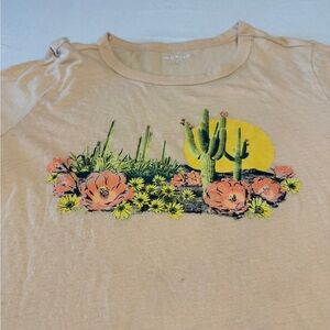 Tan t-shirt featuring a colorful cactus and floral graphic. Perfect for casual wear.