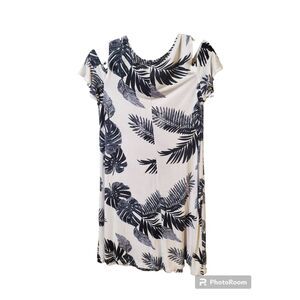 This Old Navy T-shirt dress features a beautiful monstera leaf print in shades of blue on a white background. It's made of a comfortable blend of polyester and cotton, perfect for a casual occasion in the summer or spring. The dress is a size medium with short sleeves and a short length. It's ideal for women looking for a stylish and versatile addition to their wardrobe. The brand is Old Navy, a trusted name in fashion, and the dress is in great shape for its pre-owned status.