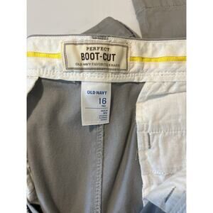 Old Navy “Perfect Boot-Cut” women’s khakis in size 16 Tall. Soft cotton-spandex blend with comfortable stretch. Flattering boot-cut leg and versatile gray tone — great for work or casual wear.