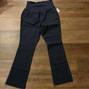 These are Old Navy maternity pants in size 16L, made of a cotton blend material with stretch. They feature a full panel for comfort, a bootcut leg style, flat front, and long accents. The pants are in a solid blue color, suitable for various occasions like travel, casual wear, work, or business. They have pockets and a high rise, making them a versatile and comfortable choice for pregnant women. 32”L