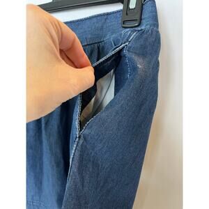 Discover effortless style with this charming A-line skirt in a versatile blue chambray. Crafted from 100% cotton, it offers a comfortable fit with an elastic waist and handy pockets, making it perfect for everyday wear. Whether you're heading to a casual brunch or a relaxed day out, this short skirt is your go-to choice for all seasons. Its classic design ensures you stay chic and comfortable, no matter the occasion. This pre-owned piece is ready to add a touch of elegance to your wardrobe. *Small snag in fabric as shown in photo*