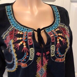 - embroidered pattern on front with scoop neckline with keyhole tie.