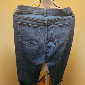 These Boyfriend Extra High-Rise blue jeans feature deep pockets, cuffed and uncuffed legs, and a faded knee. They are pre-owned and are in great condition.