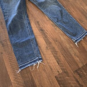 Stylish boyfriend jeans. Classic blue denim. Frayed hem for a casual look. Comfortable fit.