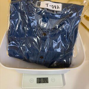Keywords: denim blouse, ruffle collar, button down, long sleeve, casual top, Old Navy, womens blouse, denim shirt, blue blouse, ruffled neckline, cotton blouse